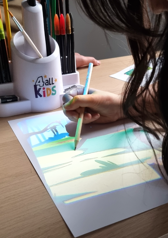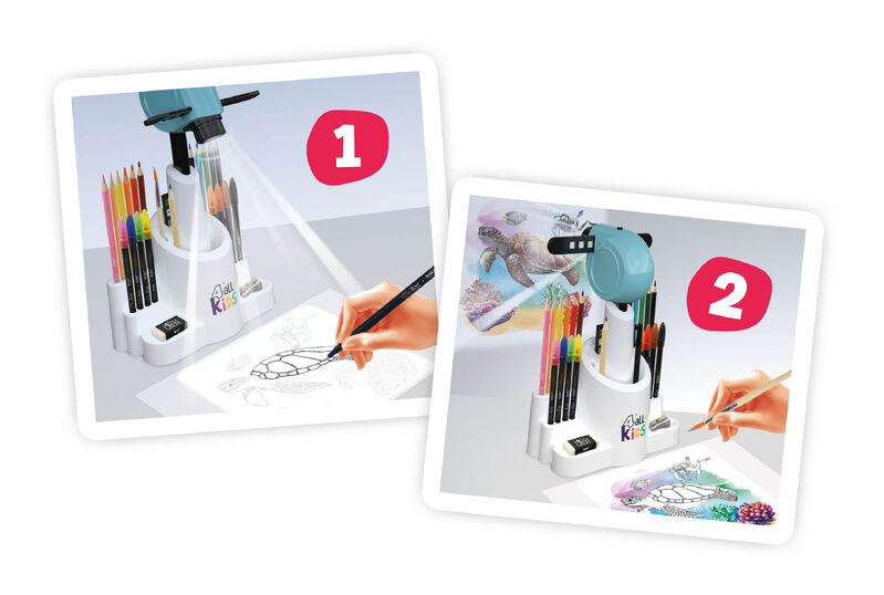 A height‑adjustable drawing projector that lets children trace outlines and colour with guided projected images.