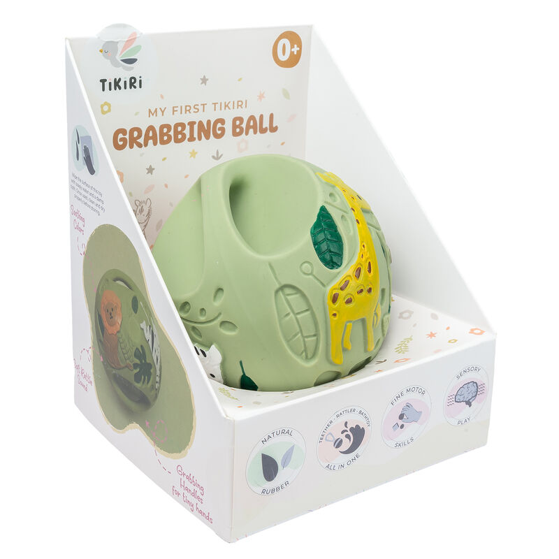 The Safari Green Grabbing Ball Natural Rubber Toy by Tikiri is an engaging and safe toy for babies. Made from 100% natural rubber, it is designed for easy gripping by little hands. The toy is perfect for teething and sensory play, providing tactile stimulation and promoting fine motor skills. The gentle rattle sound provides auditory stimulation, while the soft rubber texture soothes sore gums.