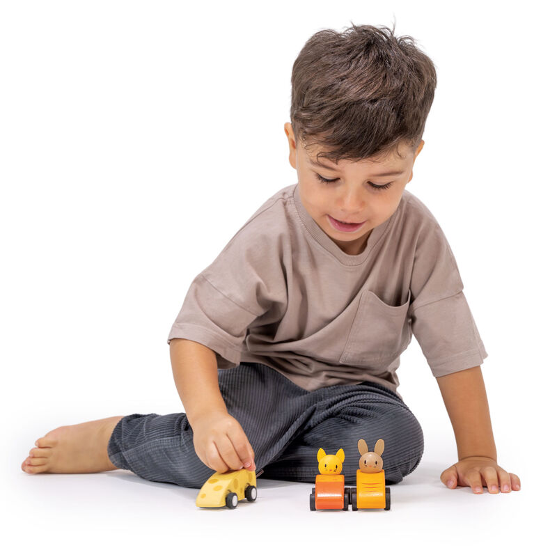 3 pull back racing vehicles, that when pulled back will whizzoff at speed! A rabbit in a carrot, a mouse in a cheese triangleand a cat in a fish shaped car.
