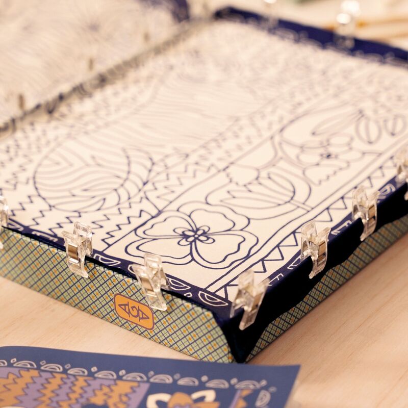 This Atelier 10 kit introduces the basics of silk painting using a pre-outlined 130 a— 34 cm silk scarf that guides the flow of colour. The box includes four 30 ml bottles of silk paint, two paintbrushes, a paintbrush holder, twenty sewing clips, a template, a leaflet, and a QR-linked video tutorial. Everything is stored in a reusable box, giving you a calm project to complete at home.