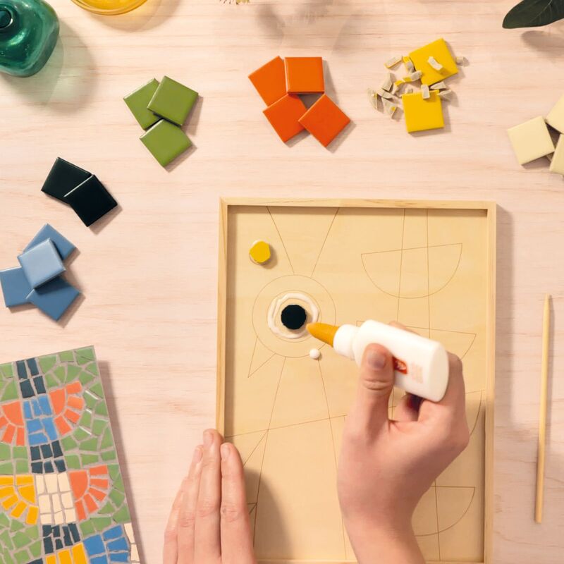 This Atelier 73 kit introduces mosaic making through a printed wooden panel used as the base for arranging ceramic tiles. The set includes one hundred tiles, mosaic nippers, a bag of cement, a flexible spatula, a tube of glue, a template, a leaflet and a QR‑linked video tutorial. Everything is stored in a reusable box, giving you a calm activity to complete at home at your own pace.