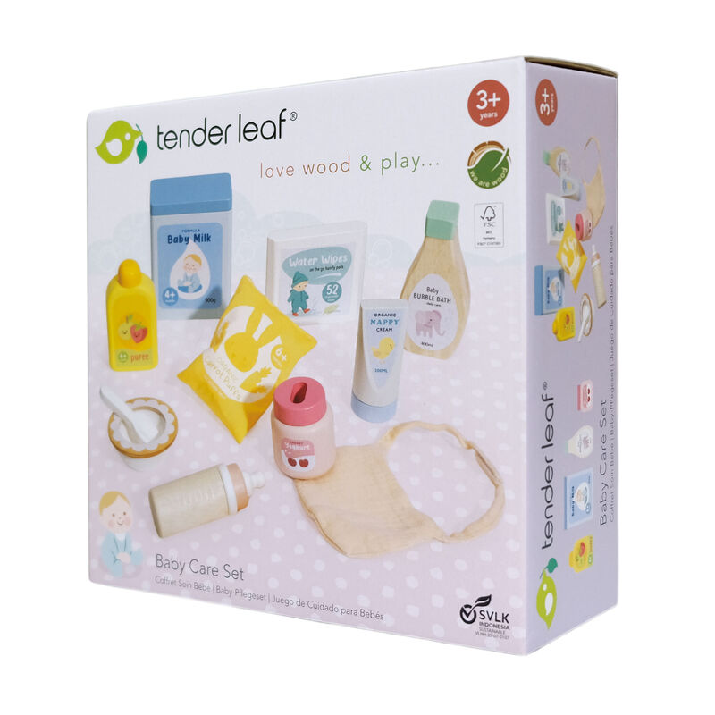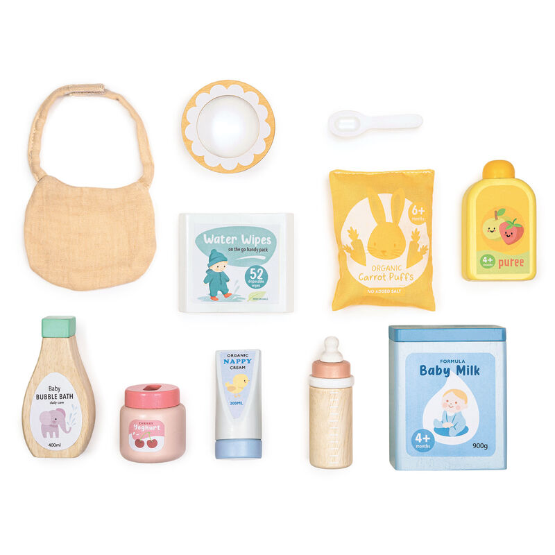 Going shopping for baby? Essentials such as baby milkpowder, bubble bath, wet wipes, fruit puree, nappy rashcream and a fruit yoghurt are perfect for baby dolly. A babybottle, bib, bowl and spoon complete the set.