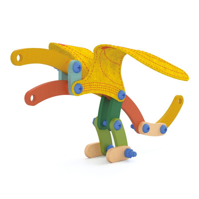 A progressive construction activity designed for children aged 6 years and up. Using sturdy wooden pieces, nuts, and bolts, children assemble prehistoric animals that stand upright, following the model cards or creating their own designs. The set includes a specially designed screwing and unscrewing tool made for small hands, supporting dexterity, concentration, and hand eye coordination. Embroidered felt elements add texture and character to the dinosaur designs, while the variety of pieces encourages experimentation and creative building. Handy compartments inside the box help keep all components organised between play sessions.