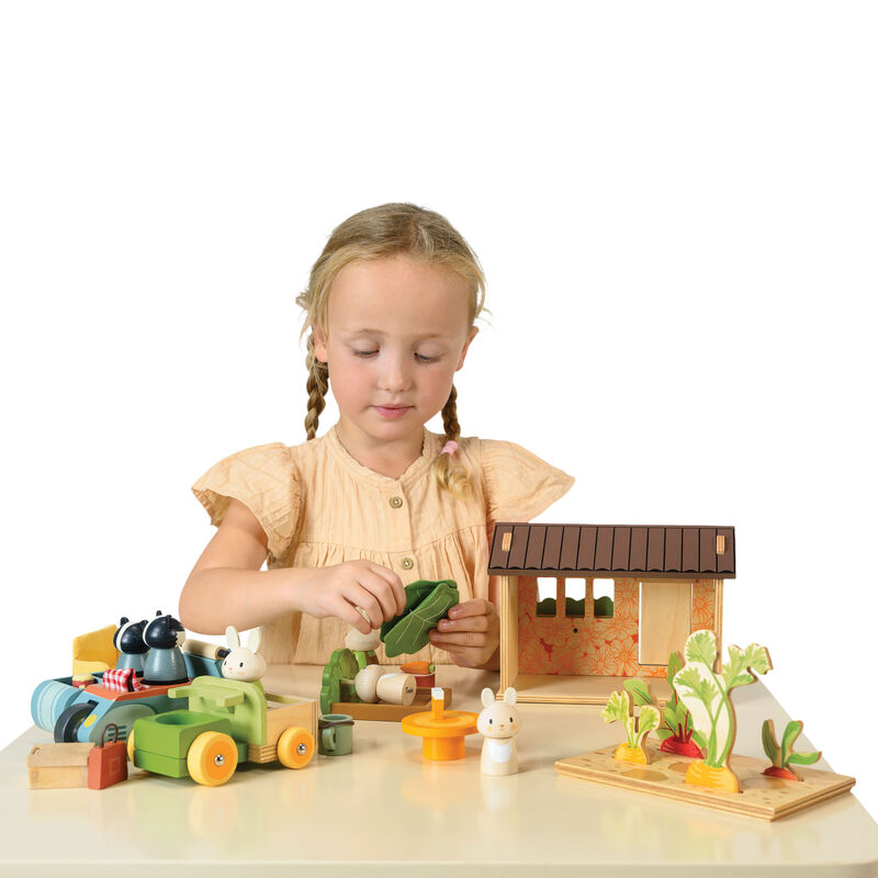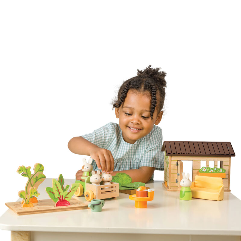 A family of four hungry bunny rabbits has taken residence inan old garden shed! Remove the roof panel and the back wallto create a magical vegetable garden complete with growingcarrots, turnips and beetroots. A baby pram has beenfashioned out of an old crate for father bunny to ferry thetoddlers Twix and Twinkle to and fro, while mummy bunnymakes up the cabbage bed and waters the vegetables. Whenthey all get home there is carrot juice and carrot cake fordinner!
