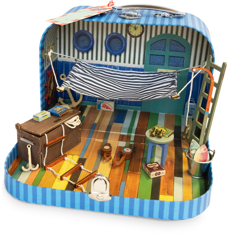 The Sailor's Cabin Mansion To Go is a portable wooden dollhouse with a fold-open design, detailed interior, and carry handle for play on the move. Paired with the Grandpa Sailor Plush – a soft character toy with embroidered features and a classic outfit – this combo adds personality and storytelling potential to any playtime adventure. Available for a limited time only.