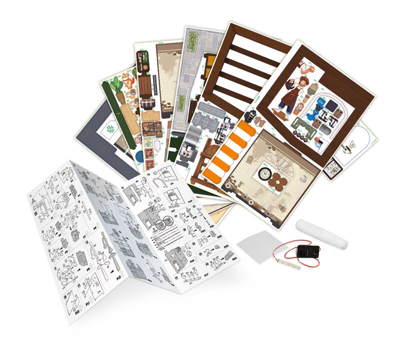 The Coffee Shop Diorama Kit includes over 100 pre‑cut pieces and accessories to assemble a miniature café scene. The finished display is detailed and compact, making it suitable for collectors, hobby crafters and children who enjoy small‑scale creative projects.