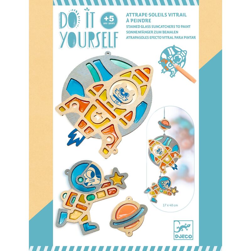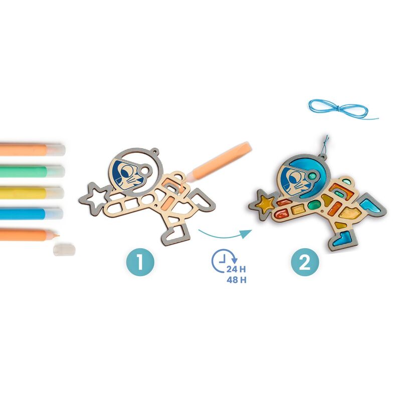 A creative activity kit designed for children aged 5 years and up. Children fill the wooden suncatcher shapes with stained glass paint, working colour by colour using the provided templates. Once dry, the paint becomes translucent, allowing light to shine through and reveal layered colour effects. The wooden pieces are protected with removable film during painting, making the activity easy to manage. The three suncatchers can be hung separately or joined together, supporting creativity, patience, and pride in a finished decorative piece.