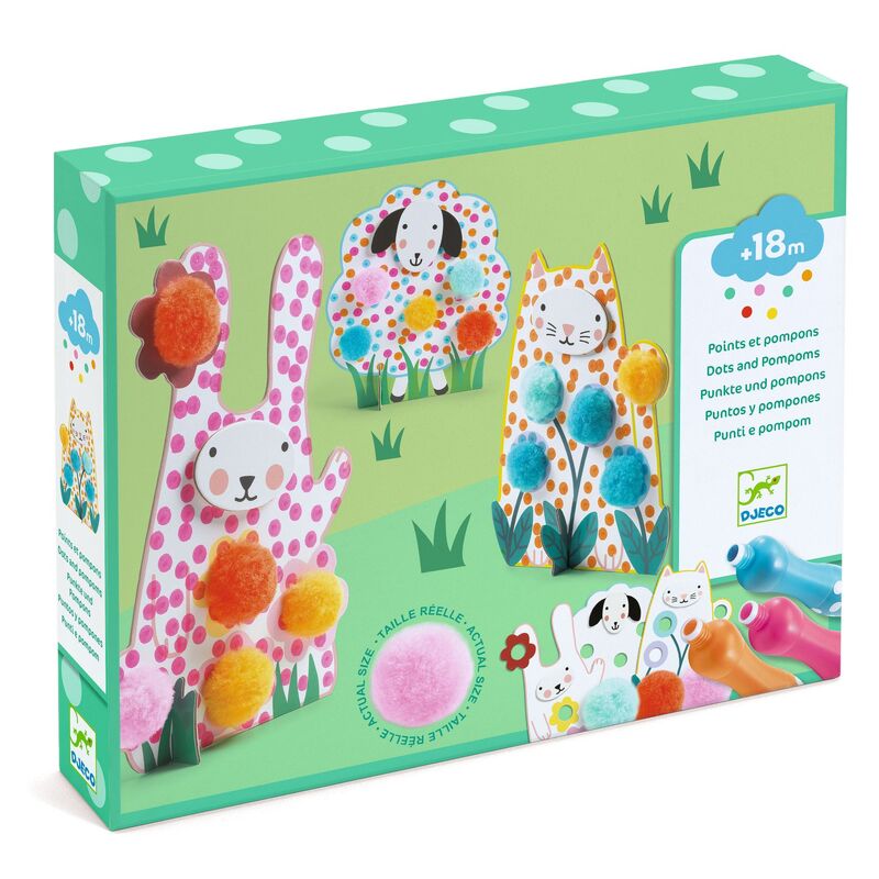A sensory creative activity designed for children from 18 months. Children decorate three large cardboard animal figures by making dots with ergonomic foam markers, placing soft pompoms, and attaching animal faces using modelling clay. The materials are adapted for little hands, with washable ink, large pompoms, and no glue required. Each animal is illustrated on both sides and includes a stand, allowing children to display and keep their finished creations. The combination of dotting, pressing, and handling different textures supports fine motor development, colour discovery, and early creative confidence. Made using FSC certified paper and cardboard.