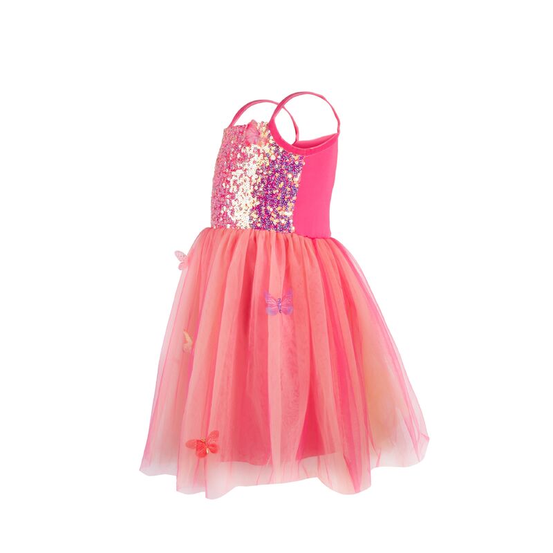 This bright pink butterfly dress pairs a sparkling sequin bodice with a soft, layered tulle skirt for a lively, eye‑catching look. The skirt features attached butterflies in a mix of colours, adding gentle detail and movement as the wearer walks or twirls. Simple straps keep the dress easy to wear, while the lightweight feel makes it a fun choice for parties, dress‑ups or imaginative play at home.