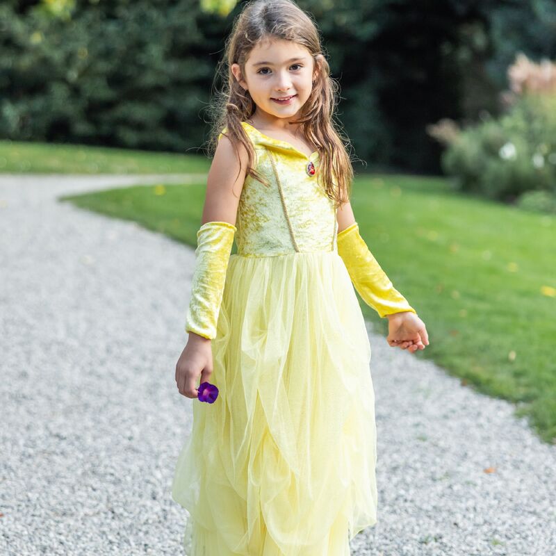 This yellow princess dress set brings a classic fairytale look to dress‑up play. The outfit features a velvety bodice with a decorative jewel at the neckline and a full, gathered skirt with shimmery mesh layers that create a soft, flowing shape. The set also includes matching forearm accessories made from the same golden fabric, adding an extra element of elegance to the costume. Ideal for parties, performances or imaginative storytelling, this dress offers children an easy way to step into a favourite character and enjoy expressive play.