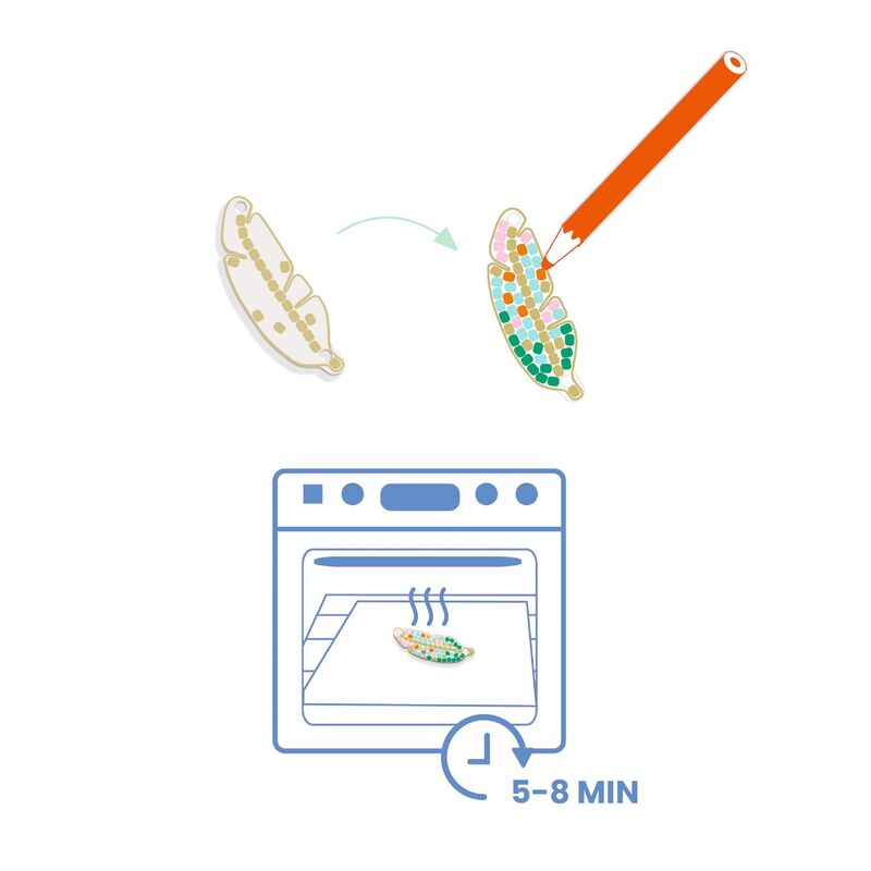 A creative jewellery making kit designed for ages 8 years and up. Children colour transparent shrink plastic shapes using the dot by dot method, then an adult helps with the oven step where the pieces shrink and harden. Once cooled, the pieces are assembled into one necklace and four bracelets using the included chain, rings, and elastic thread. The activity supports fine motor skills, focus, and creativity, while giving children the satisfaction of wearing or gifting their own handmade jewellery.