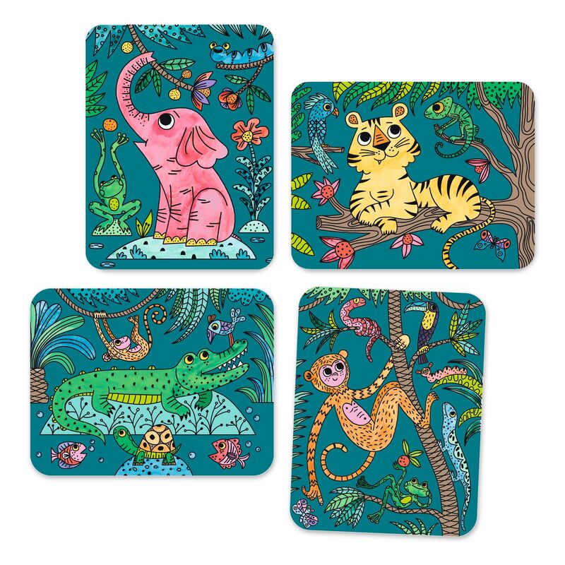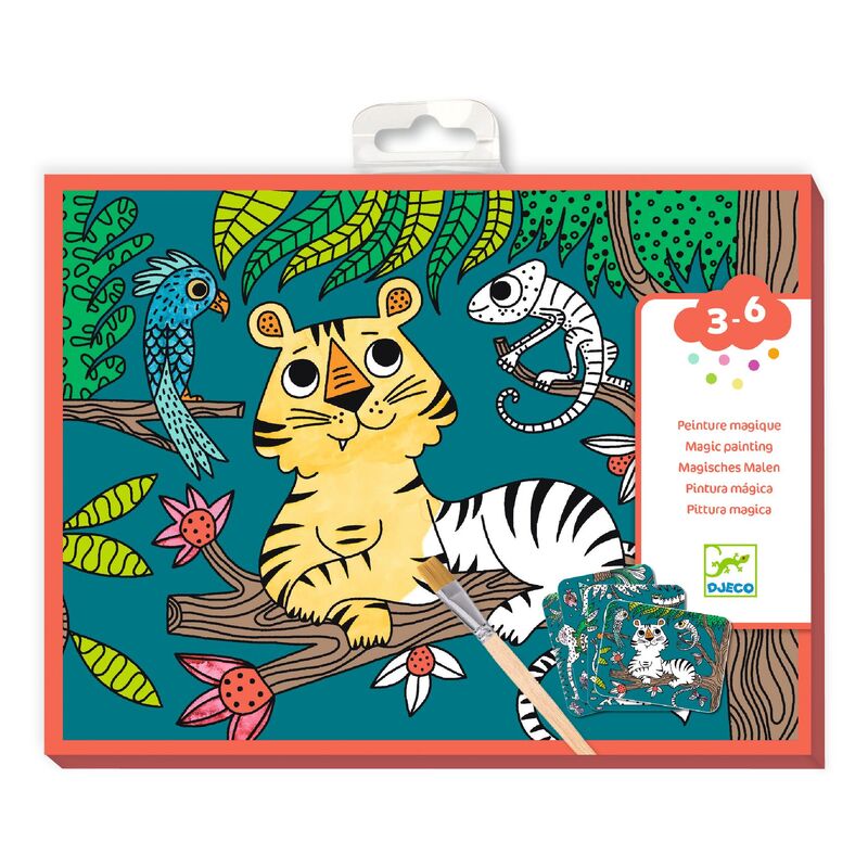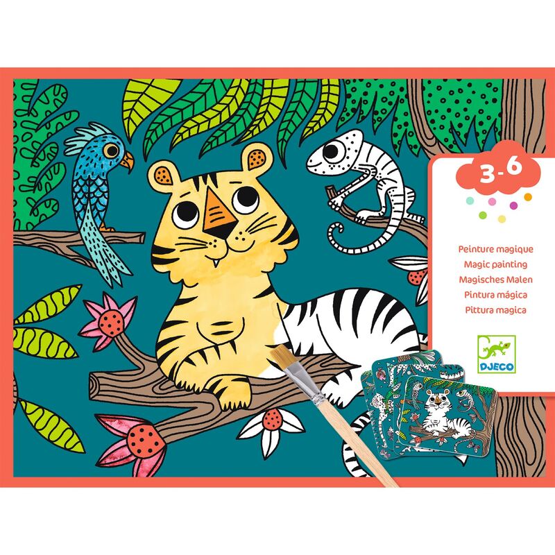 A water‑painting activity designed for children aged 3 to 6 years. Using a small wooden paintbrush and water, children paint over black areas to reveal hidden colours beneath, creating vibrant jungle pictures as if by magic. The boards are coated with a special varnish that guides the brush and helps limit spillover, making the activity clean and easy to manage. All materials are included, with no additional equipment required. A picture‑only instruction booklet allows children to complete the activity independently while developing fine motor skills and concentration.