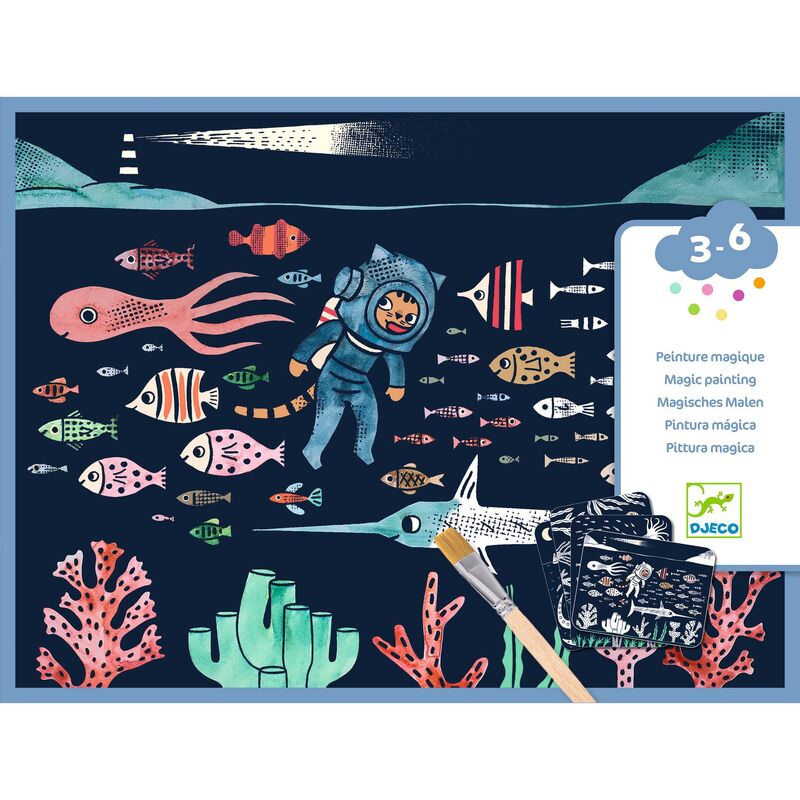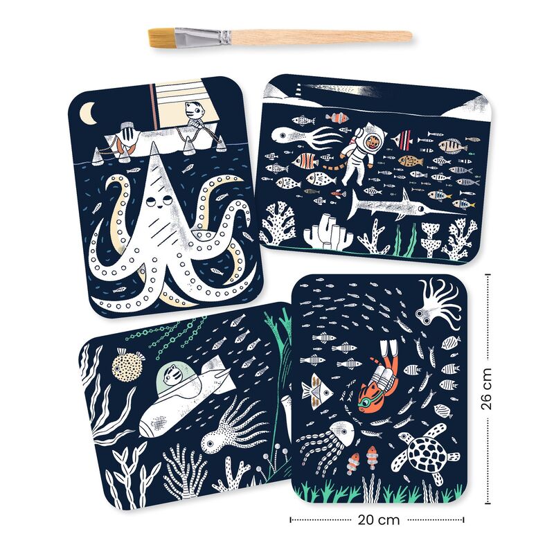 A water‑painting activity designed for children aged 3 to 6 years. Using a small wooden paintbrush and water, children paint over black areas to reveal hidden colours beneath, bringing ocean scenes to life as if by magic. The boards are coated with a special varnish that guides the brush and helps limit spillover, making the activity clean and easy to manage. All materials are included, with no additional equipment required. A picture‑only instruction booklet allows children to complete the activity independently while developing fine motor skills and concentration.