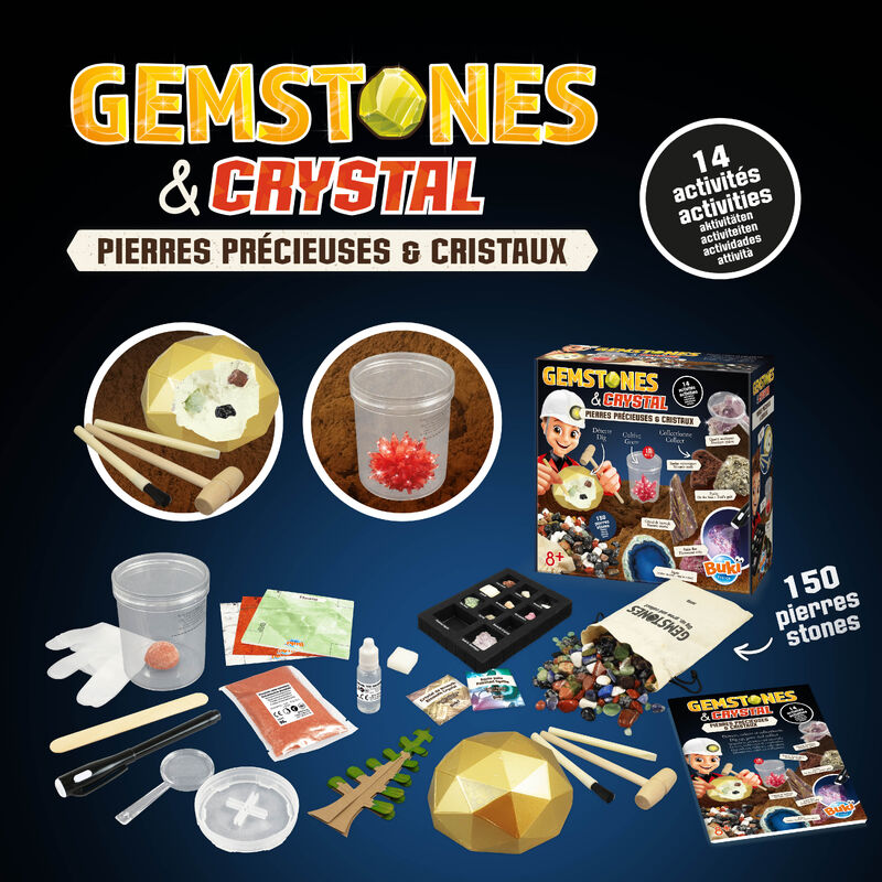 A large geology kit with real stones, crystal‑growing activities and identification tools.
