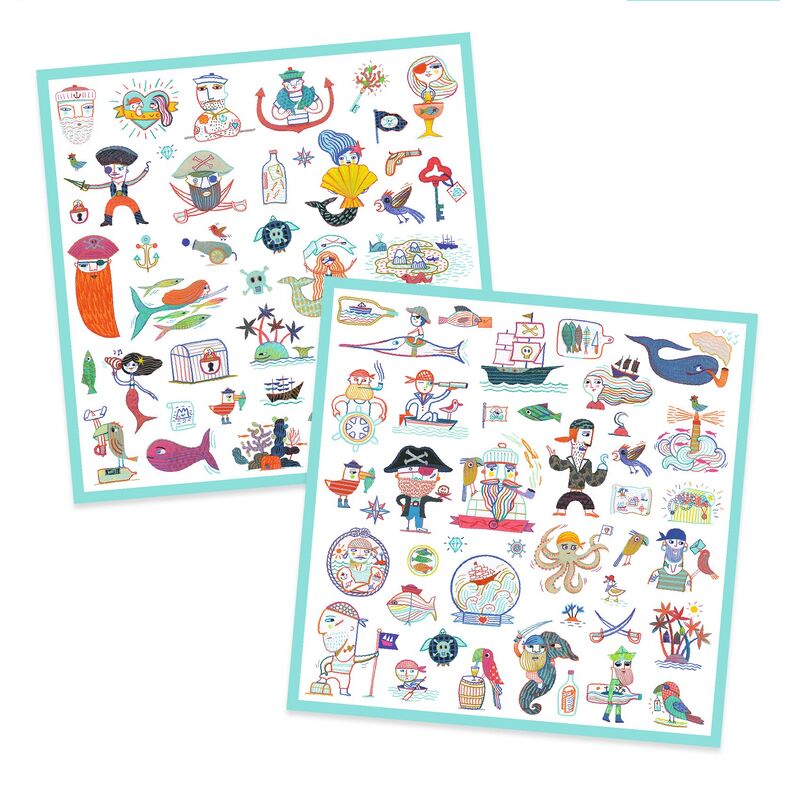 A sticker activity set designed for children aged 4 to 7 years. The pack includes 160 paper stickers featuring pirates, parrots, ships, and sea themed details. Two different sticker sheets are included in duplicate, allowing favourite designs to be reused. Children can create their own pirate scenes, add details to drawings, or decorate notebooks and cards. This activity supports fine motor skills, creativity, and independent play through simple, screen free fun.