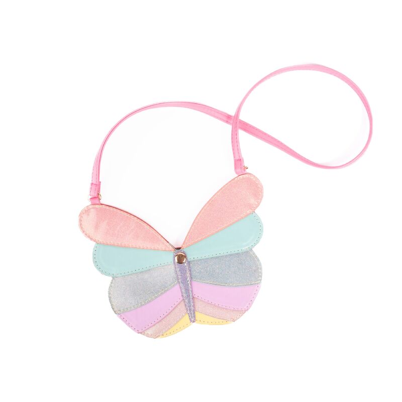 A pastel‑coloured butterfly purse designed for dress‑up and gentle accessorising.