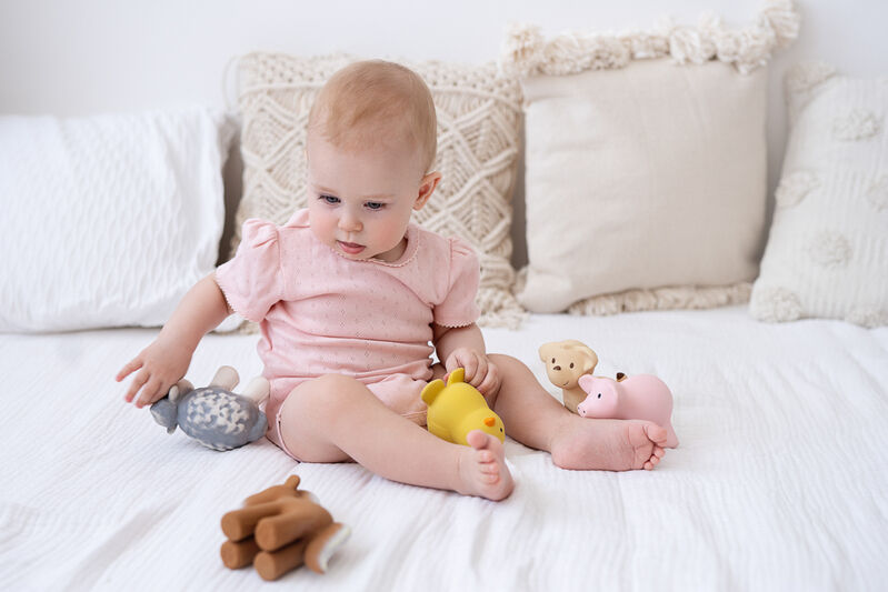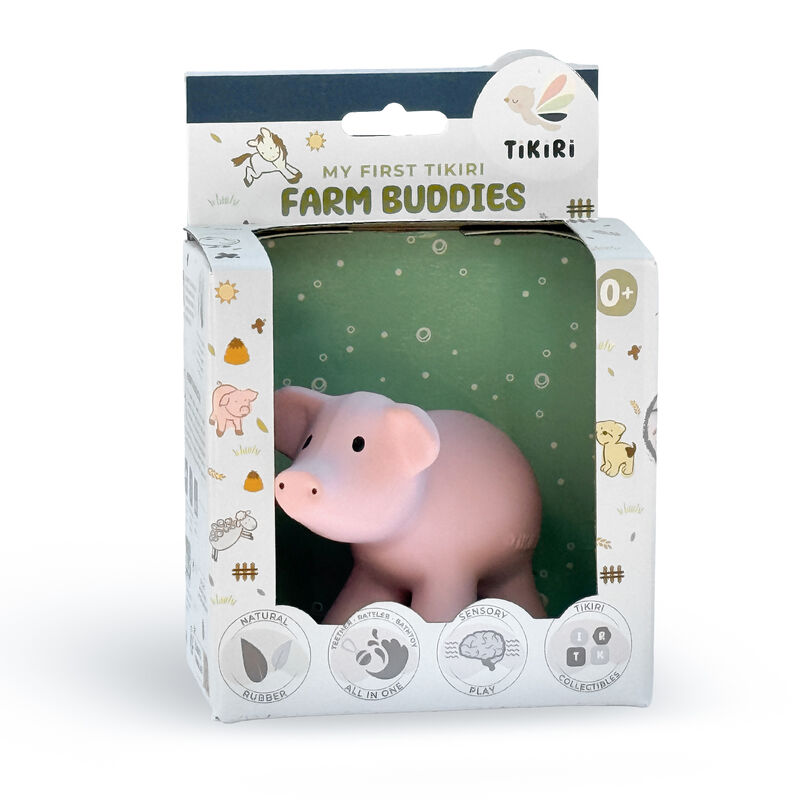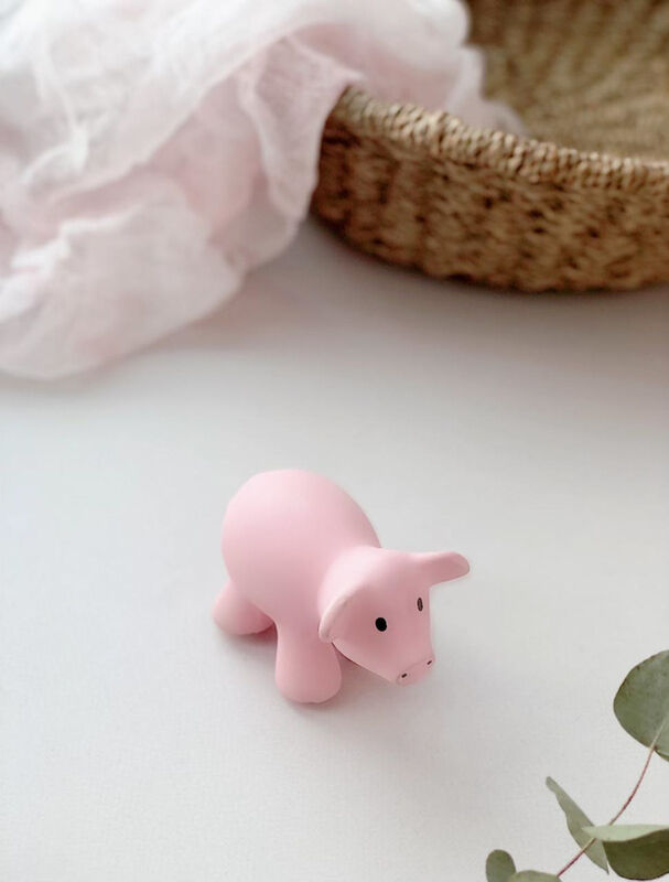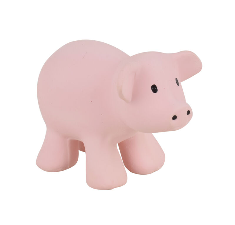 An adorable all rubber pig toy that is great for little hands to grab and squeeze.