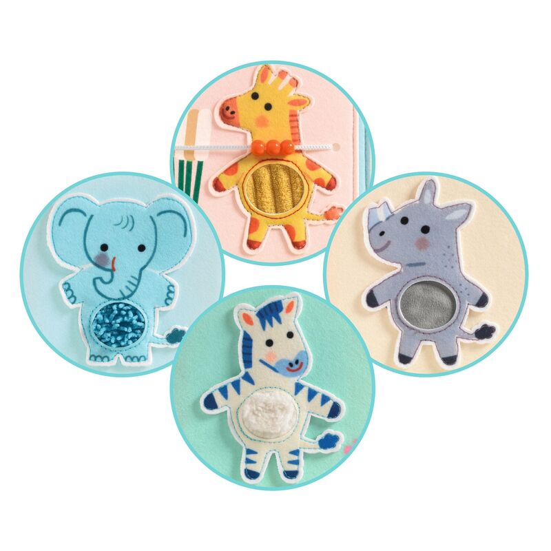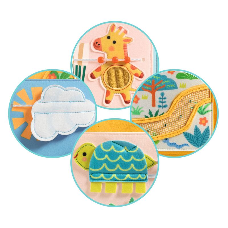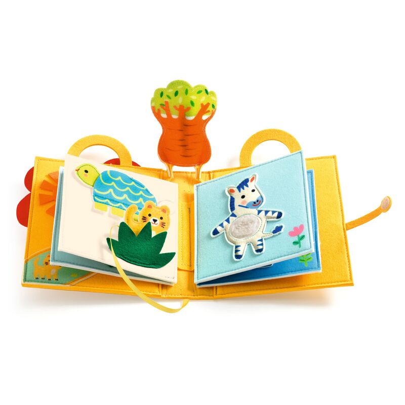 A sensory activity book designed for children from 12 months. Made entirely from embroidered and printed felt, each double page introduces a new texture, action, or surprise to encourage curiosity and early exploration. A small lion cub attached by a ribbon travels through the book with the child, creating continuity and supporting gentle handling and fine motor actions. Children are encouraged to touch, lift, slide, and explore as they discover savannah animals and interactive details, including a baobab tree that unfolds when the book is opened. Soft, durable, and pleasant to handle, this first activity book supports sensory development, coordination, and early engagement through calm, purposeful play. The felt is made from 100 percent recycled fibres.