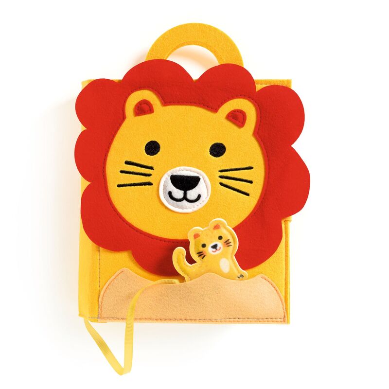 A soft felt activity book designed for babies and toddlers to explore textures, movement, and simple actions. Each page invites hands on discovery as children follow a little lion cub through the savannah.