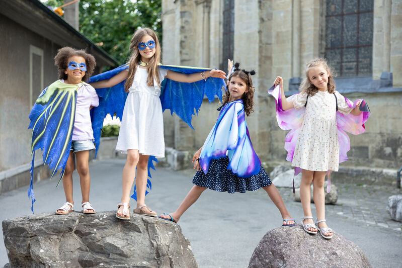 The Blue Monarch Soft Wings feature a sweeping butterfly shape with a vivid blend of blues and purples, creating a bright, painterly design across the fabric. The lightweight material moves gently as children step, flutter or stretch, and the elastic straps keep the wings easy to wear for dress‑up play indoors or outdoors. A matching antenna‑style headband adds a simple finishing touch, completing the look for imaginative storytelling and open‑ended movement.