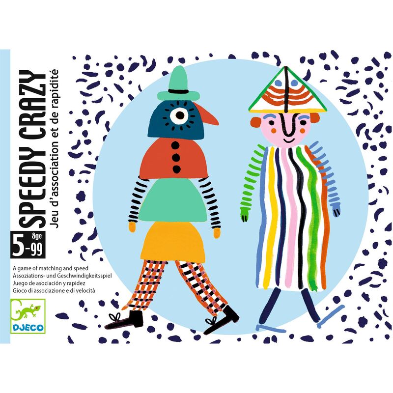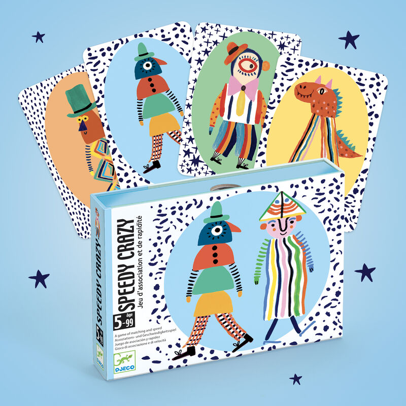 Speedy Crazy is an energetic card game for 2 to 4 players, designed for ages 5 to 99 years. All players act simultaneously, creating constant momentum as cards are played and matched in real time. Pattern, colour, and character recognition are all in play, and the situation can change in an instant. The game is easy to understand and quick to play, with rounds lasting around 10 minutes. The lively illustrations and shared action keep players engaged, while the fast decision making supports observation skills, visual discrimination, and reaction speed. Compact and durable, Speedy Crazy is ideal for travel, holidays, and spontaneous game sessions. Made using FSC certified paper and cardboard.