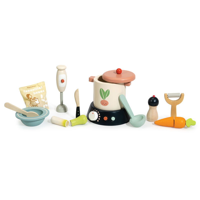 An all-in-one complete soup-making set, with all the piecesnecessary from peeling the vegetables to serving the hotsoup into a bowl. Included in the set is a soup pot with lid, abase with 2 buttons and a clacking knob to control thetemperature, a peeler, spoon, ladle and knife for slicing the 2part carrot and leek, a bowl, pepper pot, a hand-heldliquidizer, and a bag of cannellini beans.