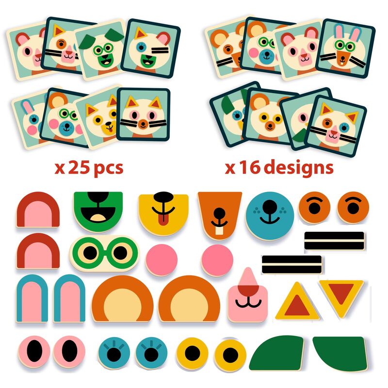 A magnetic construction and matching activity designed for children aged 2 years and up. The sturdy cardboard box features a special coated surface that allows children to play directly on it using the included wooden magnetic pieces. Children use the large, easy to handle magnets to recreate faces by following the double sided model cards or by inventing their own combinations. This open ended play encourages observation, problem solving, and early emotional awareness while supporting fine motor development. When play is finished, all pieces and cards store neatly inside the box, making TiniBox Faces a practical and portable activity for home or travel. Made using FSC certified wood.