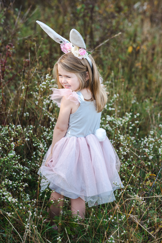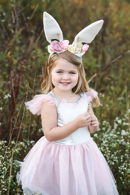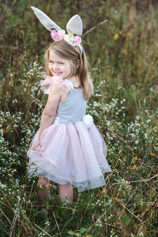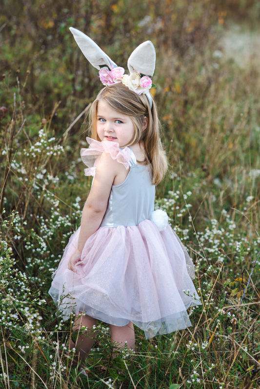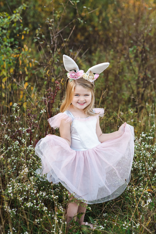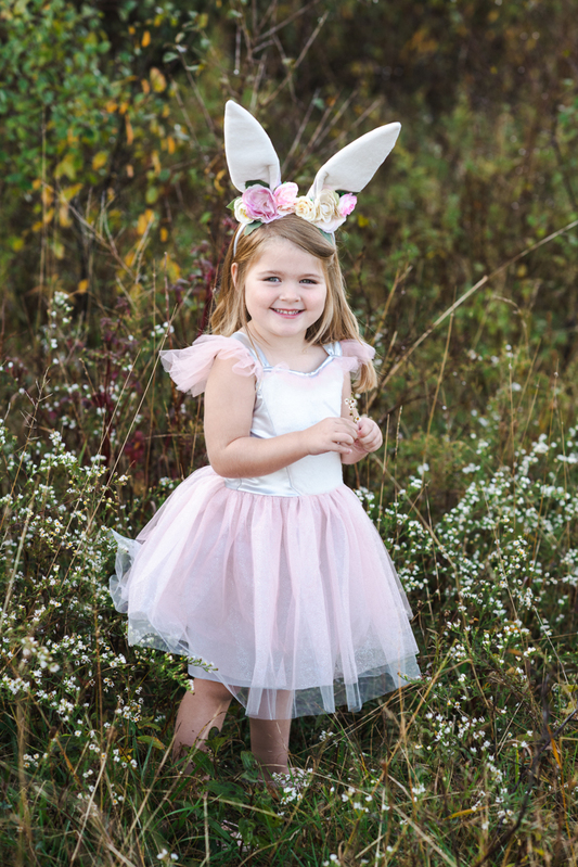 A beautiful pale pink tulle dress with a matching whimsical bunny ears headband