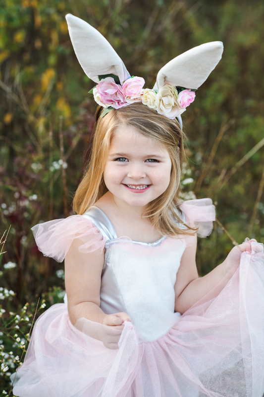 Featuring a soft fur bodice that will make children feel like a real bunny, this dress is the ultimate in comfort and style. And with a beautiful pale pink tulle skirt and matching tulle sleeves, it's the perfect outfit for any springtime occasion. This outfit is completed with a cute bunny tail on the back of the dress and a whimsical tall bunny ears headband, making it the perfect accessory for any little one who wants to hop into spring in style. Watch a child as they hop and play with joy and wonder all season long with this set.